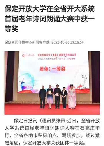 近日,全省開放大學系統首屆老年詩詞朗誦大賽在石家莊舉行,全省各地市積極響應、踴躍參加,經過激烈角逐,保定開放大學榮獲團體一等獎。《保定日報》、保定新聞傳媒中心對此進行報道。(撰稿:徐浩 校對:張霽 審核:馬俊瑞)